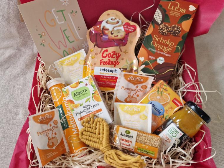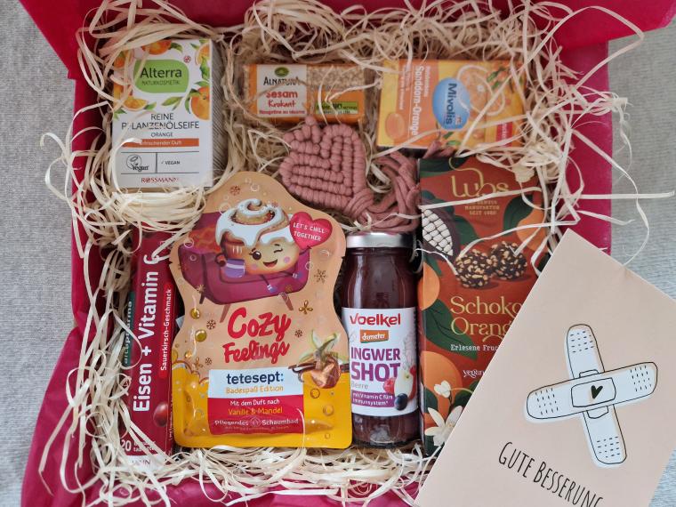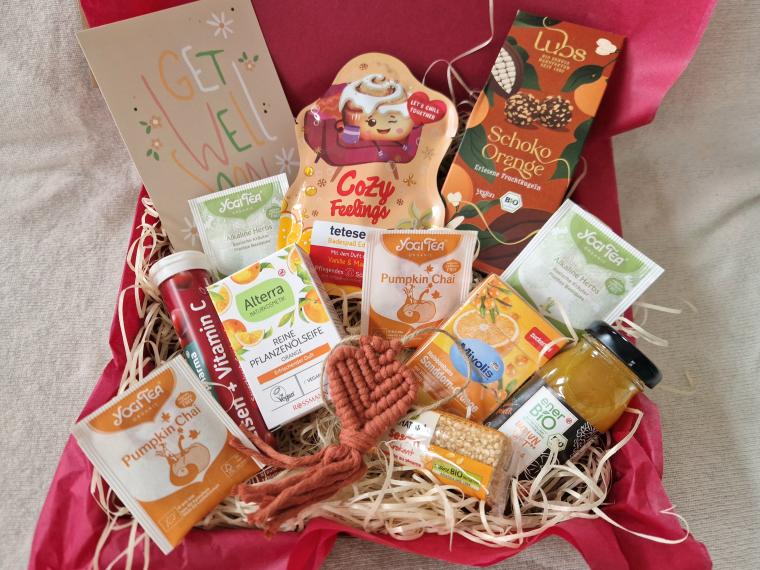 Mit diesem Geschenkset kannst du, zum Beispiel einer Freundin, einer Kollegin oder auch einem Mitarbeiter zeigen, dass du an die Person denkst und seine Genesung unterstützt. Dafür liegen der Gesundheitsbox hochwertige Artikel und ein mit Liebe aus recycelter Baumwolle handgeknüpftes MakrameeHerz bei. Deinen Grußtext schreibe ich gern auf eine von eika designte GET WELL SOON Karte.Cozy Times ist eine gemütliche Gesundheitsbox für verwöhnende Momente zur guten Besserung und hat folgenden Inhalt: